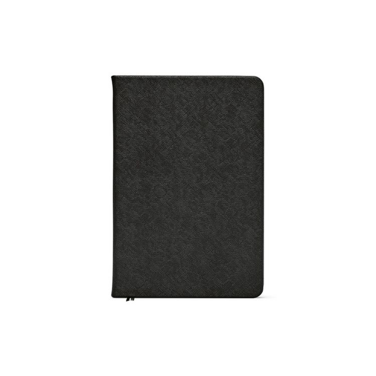 Wilde hardcover recycled PU notebook. Inside, discover two convenient pockets, ideal for organizing loose items. Two ribbon markers help you navigate the 196 80gsm FSC ivory dotted pages, with an area reserved for date and page number making it a thoughtful blend of eco-consciousness and practicality. Comes with a metal plate that can be customized and placed on the front cover of the notepad. Supplied in an individual kraft sleeve., in black color