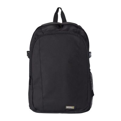 rPET polyester (300D) backpackrPET polyester (300D) backpack and laptop bag (15 inch) with 210D lining inside. Cabin-proof. With carrying loop on top, adjustable shoulder straps, and two carrying handles on the side. Adjustable straps tuck behind the padding for a carry function with side handles. Velcro laptop compartment and small zippered compartment. With ventilated padded backing. Carrying weight approx. 8 kg. Includes rPET label.