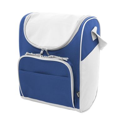 Polyester (600D) and rPET cooler bagPolyester (600D) and rPET cooler bag with PEVA interior, for six 330 ml cans. With zipper, front pocket, and adjustable strap. Capacity: 3 liters.