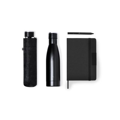 SetStylish premium set including:Recycled stainless steel double-layer thermos bottle with matte black finish and 500ml capacity. Matte silver metal handle, With stainless steel badge.RPET notepad in elegant black, with special metal detail for laser branding. Including elastic bands and fabric bookmark. Inside with 80 sheets, single-stripe layout. With RPET logo.98 cm diameter folding umbrella in black color. Made in 190T RPET pongee material. Manual opening, with windproof mechanism and fiberglass ribs. With carrying sleeve and matching straps. With distinctive RPET label.RPET ball pen with matt black finish, twist mechanism and blue ink. The RPET material is made from recycled plastic to encourage the reuse of plastic waste and help the sustainability of the planet.Set presented in an individual matte-finish, case with inside die cut for each of the elements of the set. (black color)