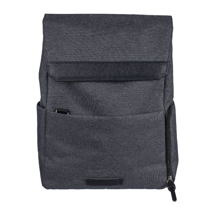 600D polyester canvas laptop backpack (15 inch) with PVC detail and 210D lining. Features a small zippered front pocket with a carabiner for keys, one zippered side compartment, one regular side pocket, and a large magnet-closed compartment with a laptop pocket. Push buttons on the side to close the backpack when not fully filled. Adjustable ventilated straps. Includes an rPET label on the front.
