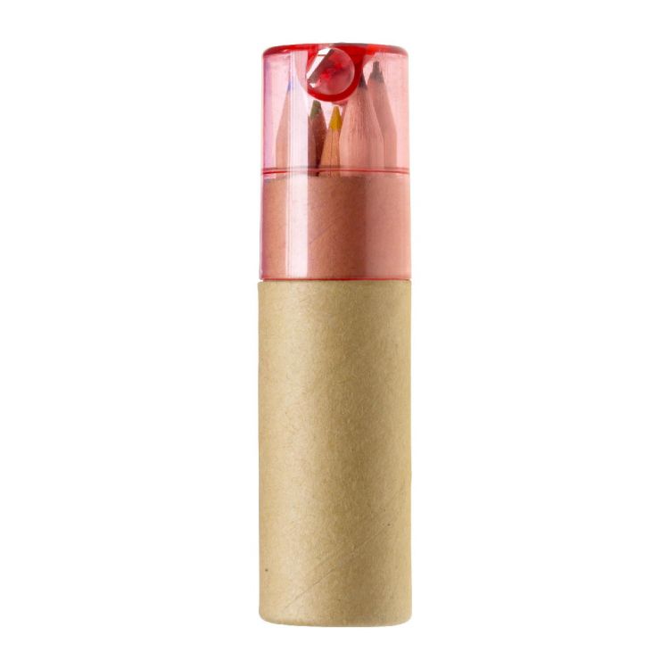 Cardboard and ABS tube with six colored pencils and sharpener integrated in the lid.