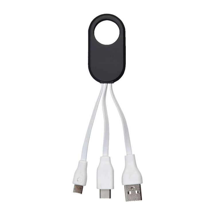 ABS 3-in-1 charging cable set with USB-C, Lightning, and standard USB. Each cable is approx. 5,5 cm long and attaches to a holder with opening (Ø 1,8 cm).