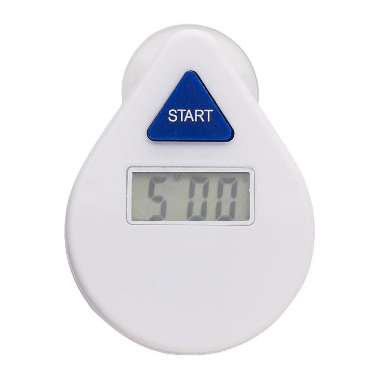 ABS digital shower timer with suction cap on the back, and push button on the front.