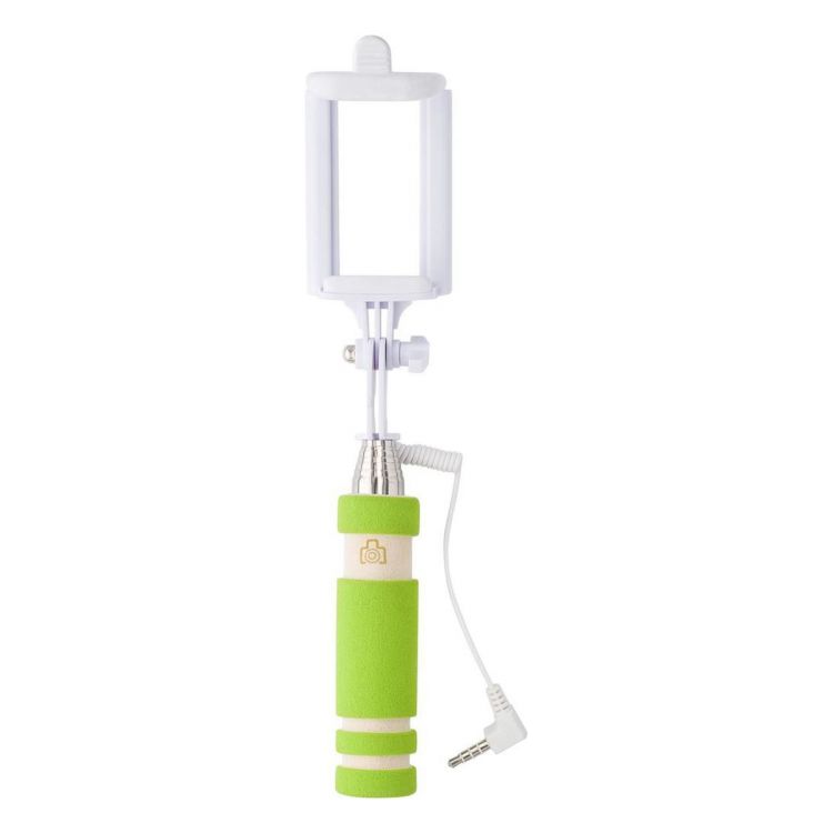 ABS telescopic selfie stick, expandable to a maximum length of 61 cm, with an EVA foam handle. Including a selfie shutter button on the handle and cable with plug, approx. 33 cm long.
