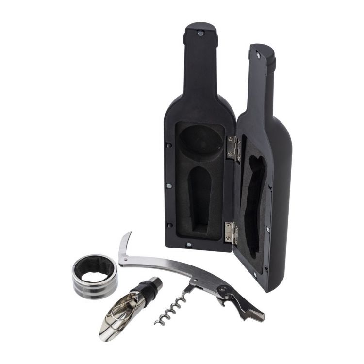 ABS wine set, with a waiter's knife, bottle stopper with pouring spout, and drip catcher. Shaped like wine bottle.