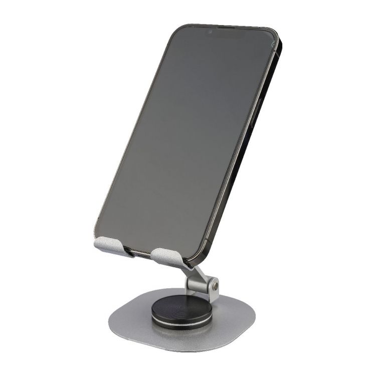 Aluminium alloy phone stand with 360-degree rotation function. Can be fully folded flat for easy storage. Sturdy and weighty design for stable support. Individually packaged in a white box.