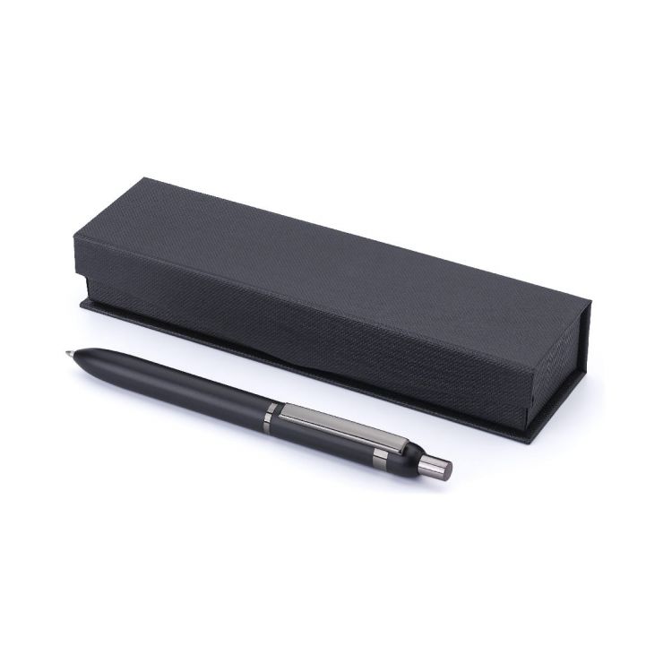 Aluminium and brass ballpen. With shiny details on the clip, ring, and push button. Blue ink. Individually packaged in magnetic giftbox with paper sleeve.