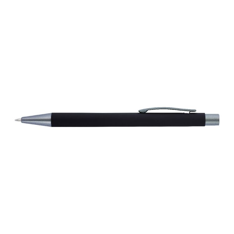 Ballpen with rubber finish. The tip, top and clip match each other with a dark grey color. Blue ink.
