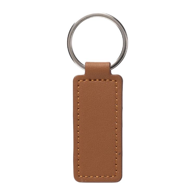 Apple leather and PU keychain with metal ring. Made from 30% apple leather and 70% PU. Includes embossing in the shape of an apple. Packaged in a kraft carton sleeve.