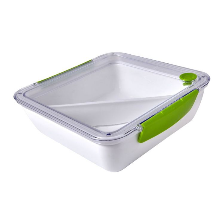 AS and PP lunchbox (920 ml) with transparent lid lined with silicone. Including separate, triangular compartment and fork.