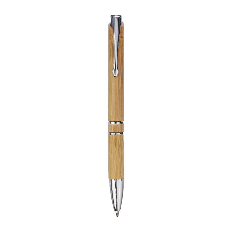 Bamboo ballpoint pen with chrome metal details and a push button. Rings, push button, and tip in plastic. Metal clip. Approx. 800 meters of writing length. Black ink.