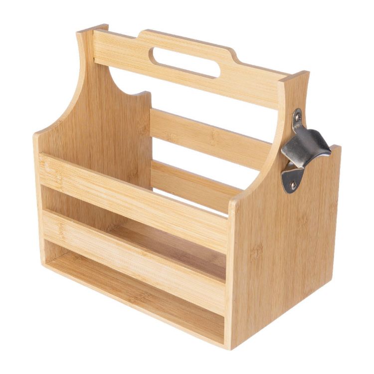 Bamboo bottle holder (suitable for beer bottles) with carrying handle. On the side, a metal bottle opener. Individually packaged in a brown carton box.