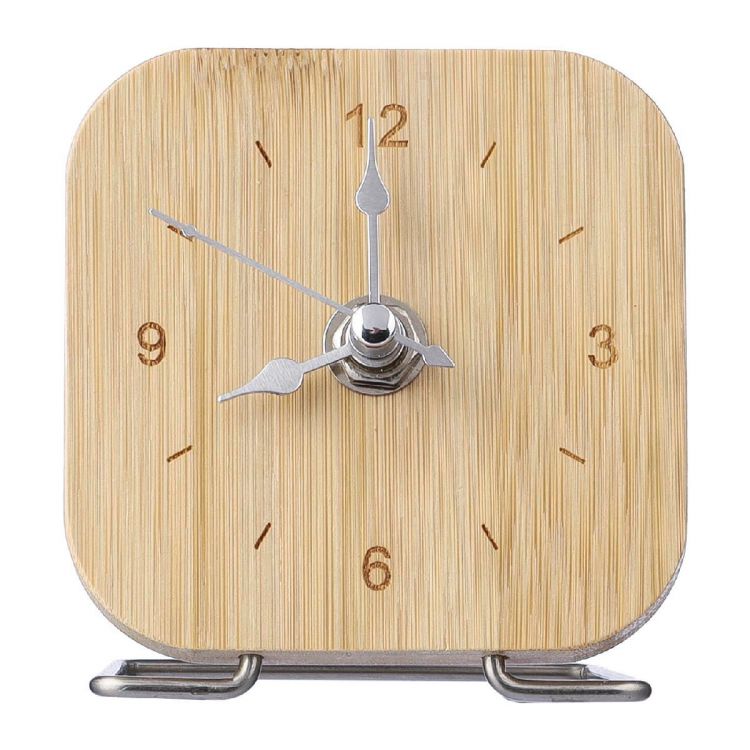 Bamboo clock with silver pointers and stand. Battery included. Individually packaged in a brown cardboard box.
