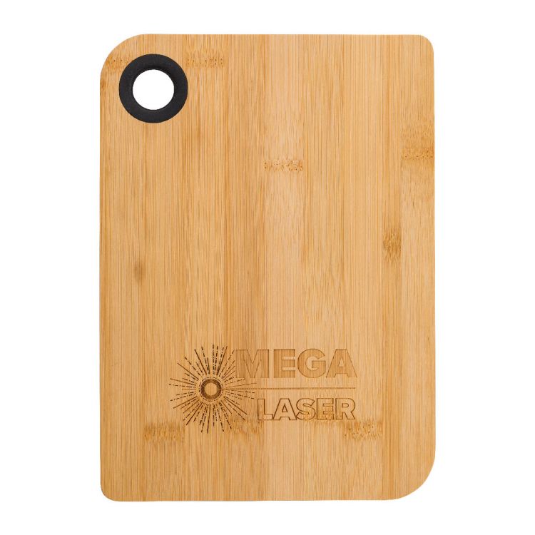Bamboo cutting board. The thumb hole is lined with a silicone ring.