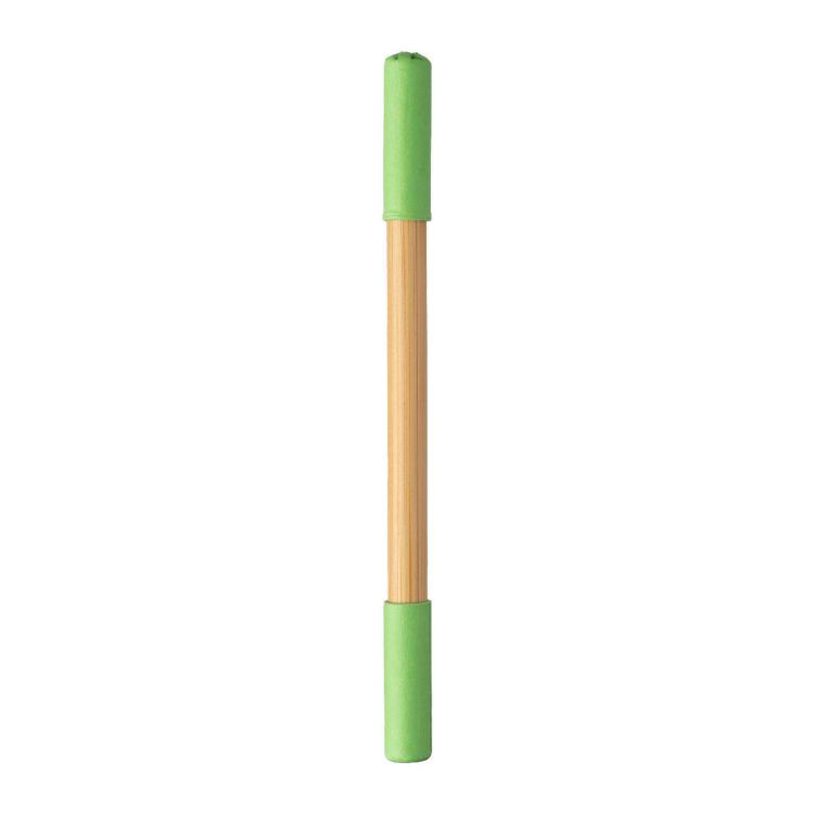 Bamboo endless pencil and ballpen. One side with endless pencil and the other with ballpen, both with colored carton lid. Blue ink.