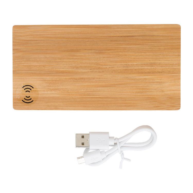 Bamboo power bank with a capacity of 6.000 mAh, with wireless technology. Input DC 5V/2A. Output DC 5V / 2A. Wireless charging 5V/1A. Li-polymer battery. Including LED indicators and charging cable (USB - micro USB).