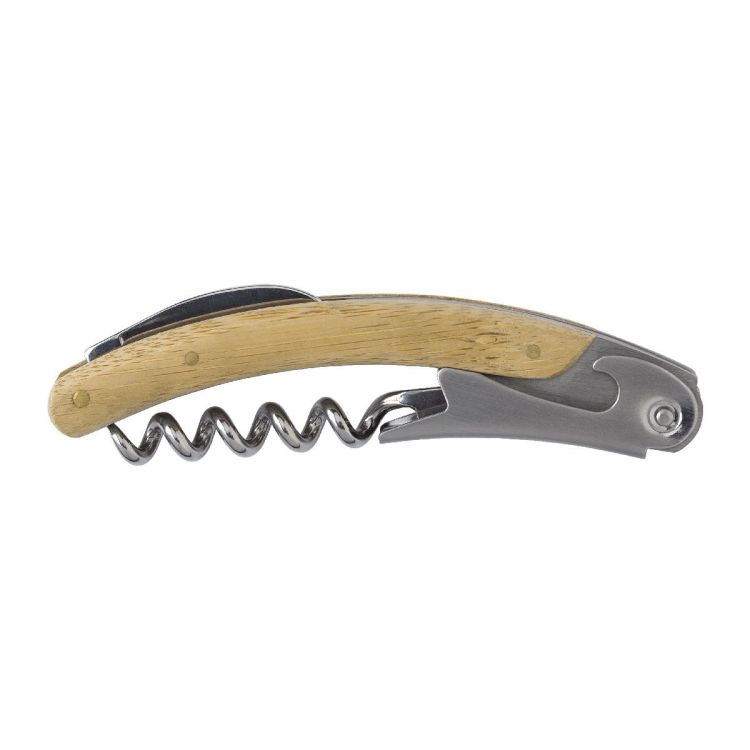 Bamboo and stainless steel waiters knife with three functions.