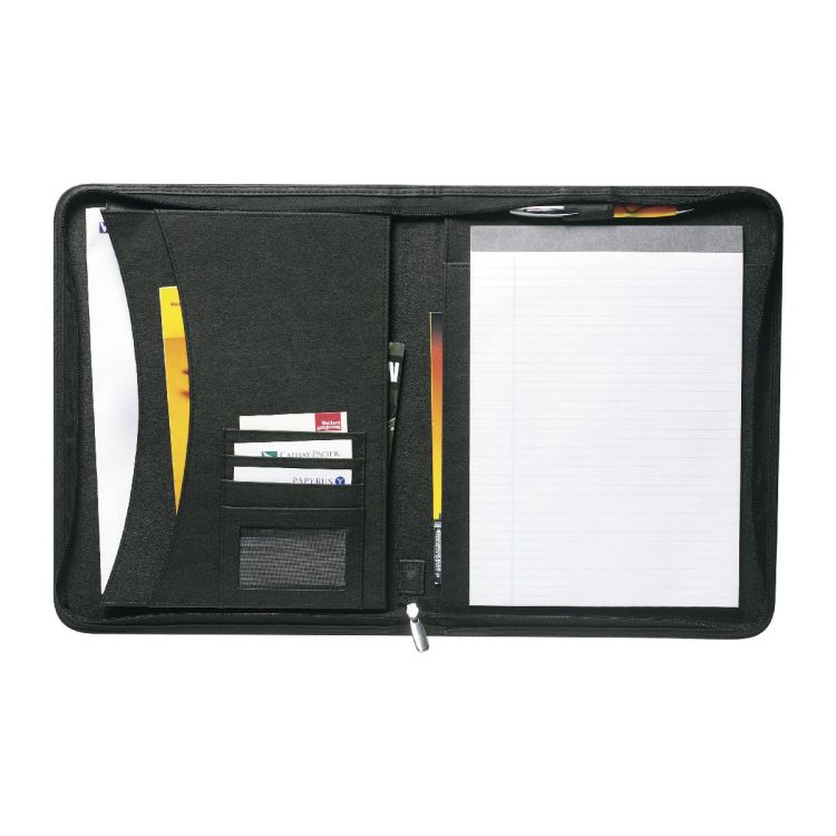 Bonded leather zipped conference folder (approx. A4), with a notepad with 30 pages, different pockets, and an elasticated pen loop (pen not included).