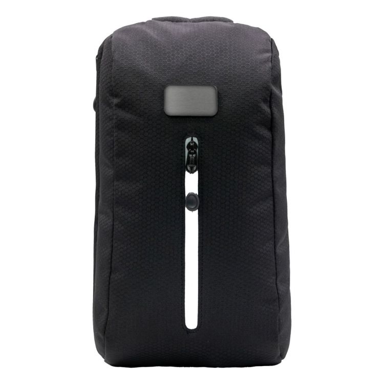 The Sling backpack is made from recycled PET bottles and designed for urban and outdoor adventures. Despite its compact size, it offers ample room to carry essentials for a day of exploring, whether you're hiking or on a casual walk. Its ergonomic cross-body silhouette and breathable mesh strap ensure comfort, with a pocket for your phone or water bottle. Sling rolls into itself, becoming a packable pillow. The waterproof fabric, anti-theft covered zipper, and reflective details offer protection and safety on the go, making it a versatile and eco-friendly choice, in black color