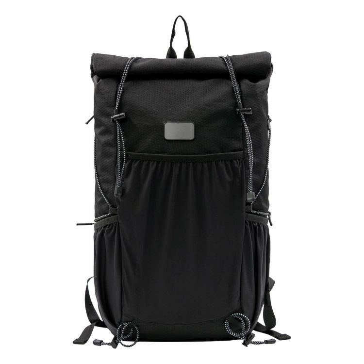 The Venturer roll-top backpack is both a stylish and eco-friendly accessory, making it an excellent corporate gift. Made from recycled PET bottles, it reflects a commitment to sustainability while offering a sleek design. Its spacious main compartment, several stretch pockets, and a padded laptop compartment (fits 16” laptop) provide ample storage for your essentials. Lightweight and equipped with a space-saving roll system, the Venturer is ideal for commuting, traveling, or casual outings. Features include an adjustable shoulder strap, roll-top closure, ventilated shoulder straps, and water- and stain-repellent fabric, in black color