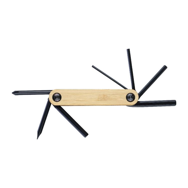 Carbon steel toolset with bamboo details. Includes 7 tools: Allen keys, Phillips screwdriver, and flathead screwdriver. Individually packaged in a brown cardboard box.