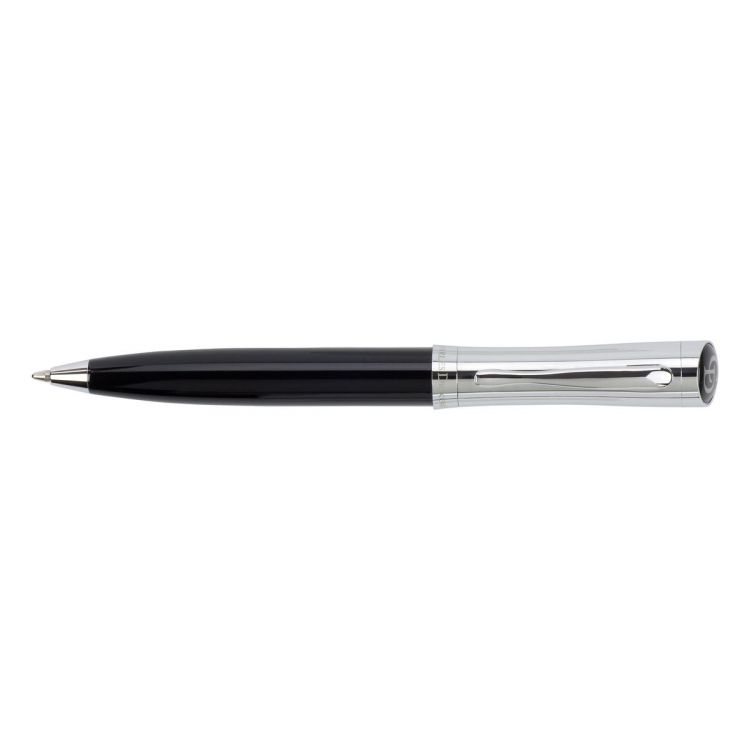 Charles Dickens® ballpen with twist action mechanism and Charles Dickens® logo on the top. Packaged in a deluxe pen case. Black ink, in black / silver color