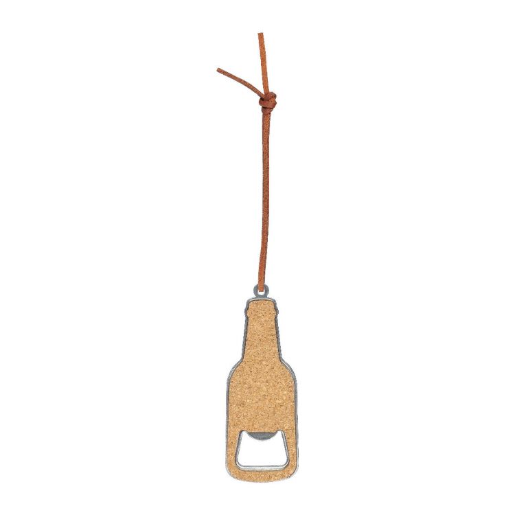 Cork bottle opener with stainless steel and two-sided cork detailing. Includes a PU cord. Individually packaged in a brown paper sleeve.