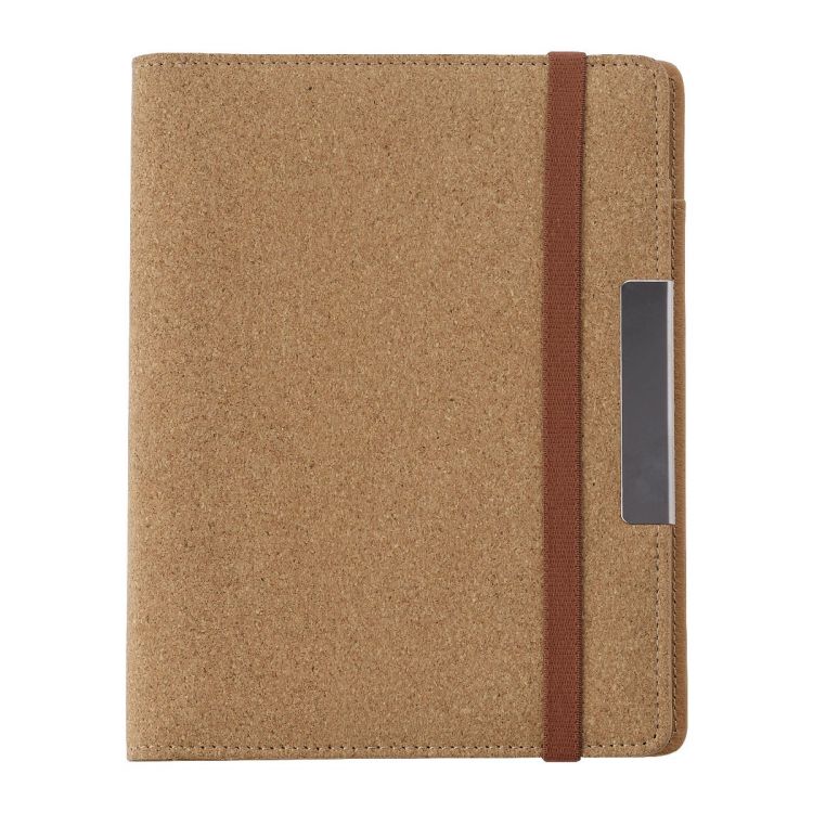 Cork conference folder, with a notepad with 25 lined pages, a rubber band over the cover, PU interior, a small mesh pocket for business cards, a larger pocket, a 20 sheet note pad and an elasticated pen loop (excluding pen).