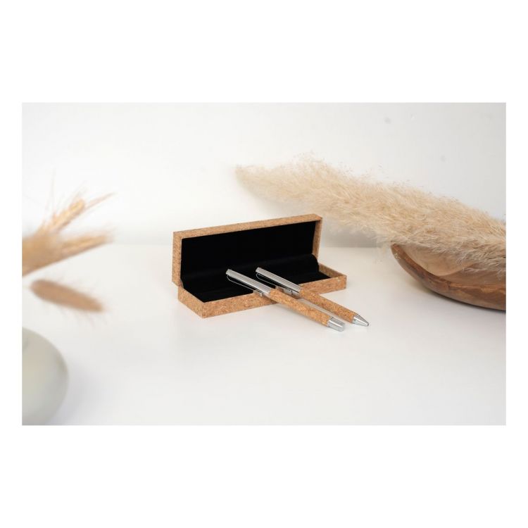 Cork and chromed metal writing set consisting of a ballpoint pen and rollerball pen. Blue ink. Packaged in a cork pen case with velvet lining, in brown color