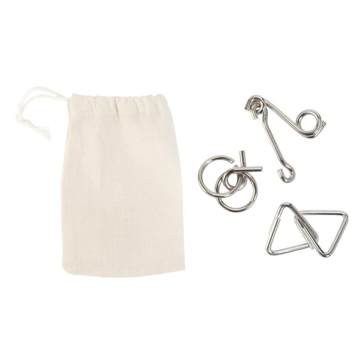Cotton (80 gr/m²) drawstring pouch with set of three steel thinking games.