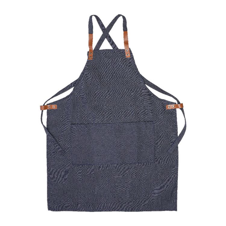 Denim (280 gsm) apron with shoulder straps and two front pockets. The denim is made from 65% polyester and 35% cotton. This apron does not have a neck strap, only shoulder straps. Denim color fastness is up to 2-3 levels. Individually packaged in a brown cardboard gift box.