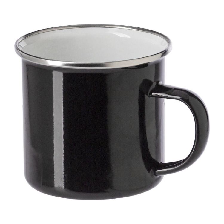 Enamel drinking mug (350 ml) with stainless steel edge. Individually packaged in a brown cardboard box. This product is not dishwasher safe.