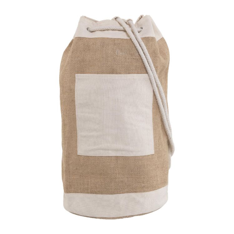 Jute duffel bag with metal eyelets, a cotton cord and front pocket.