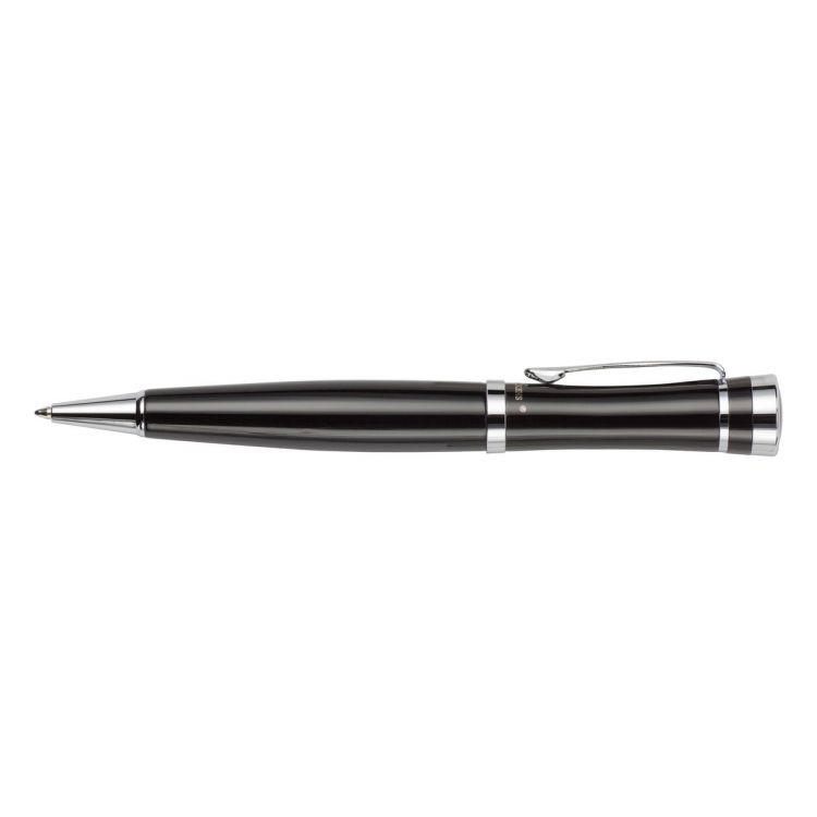 Charles Dickens® metal ballpen with silver trim and twist mechanism. Packaged in deluxe pen case. Black ink.