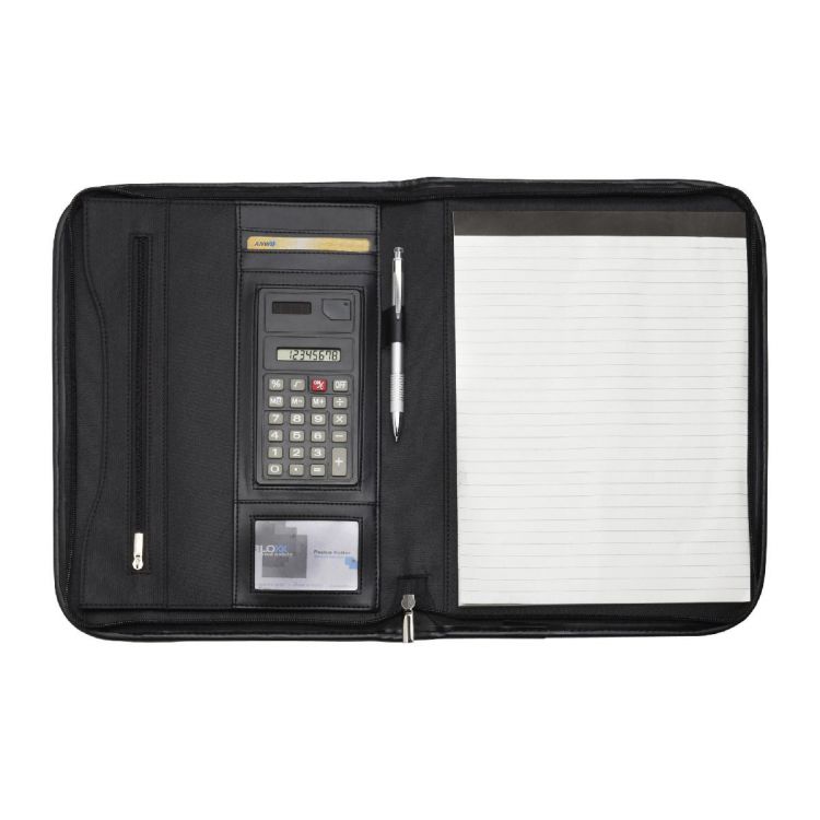 Microfibre zipped conference folder (approx. A4) with PVC edging, notepad with 20 lined pages, integrated handles which can be stowed away, zipped internal pocket, and 8 digit dual power calculator.