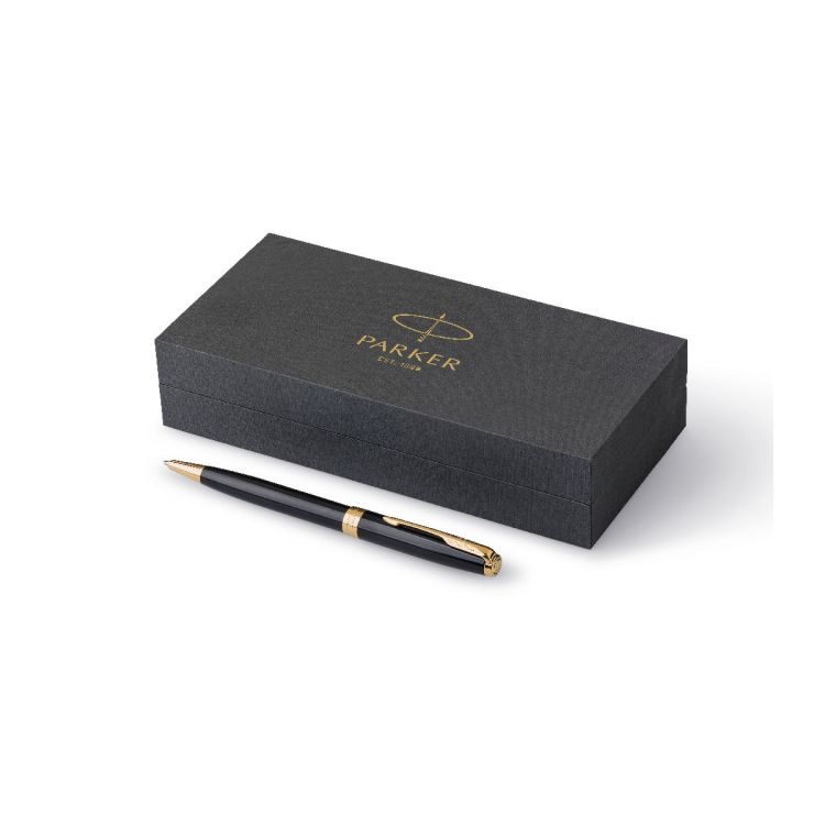 Stainless steel and laqcuered brass Parker Sonnet ballpen with twist mechanism. Black ink. Pen pre-packaged in giftbox.