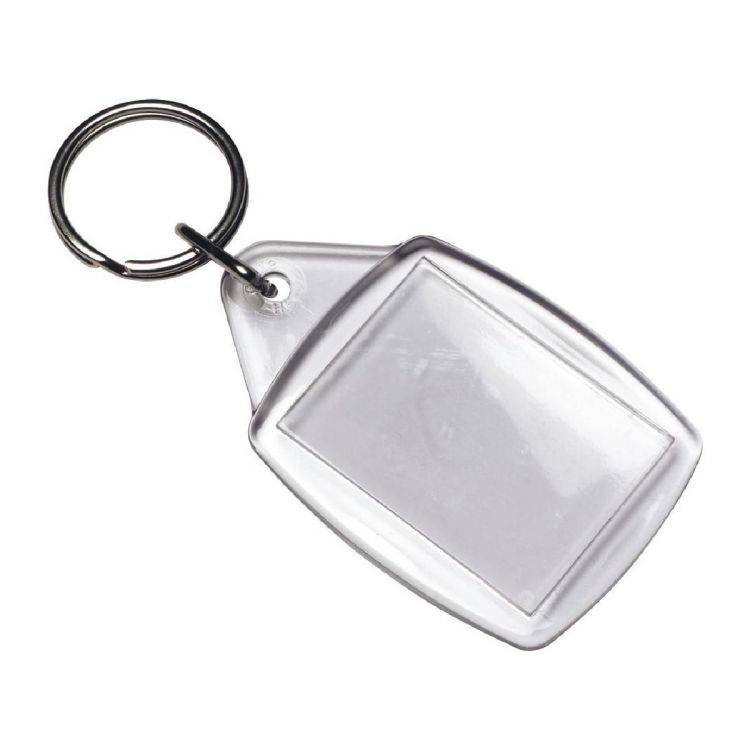 Plastic key holder on metal keyring. Printing is done on a paper insert.