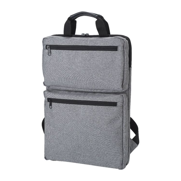 Polycanvas (300D) backpack with two outside pockets with zipper, and laptop compartment inside (15 inch). With padded shoulder straps and two short handles on top.