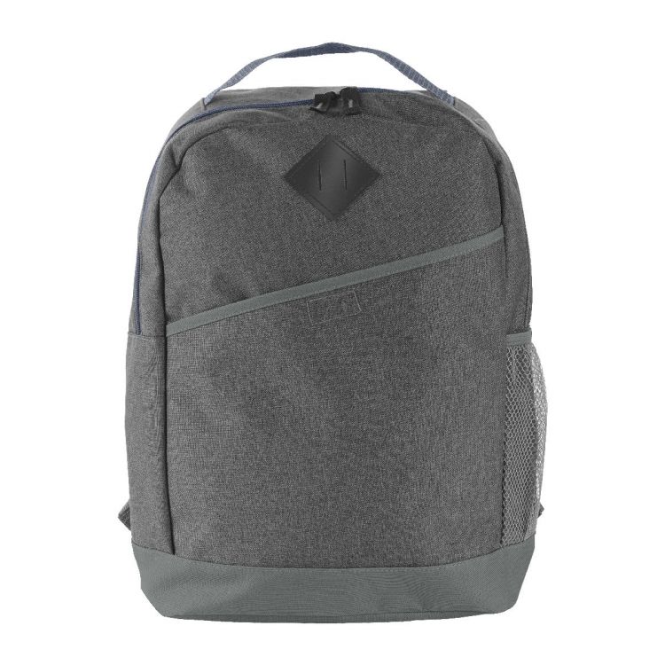 Poly canvas (600D) backpack with front pocket with Velcro closing, mesh pocket with room for one bottle on the side, and a large zipped compartment.
