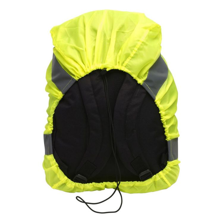 100% Polyester, neon safety cover for backpacks with two reflective stripes. Elastic to fit different sizes. For promotional use only.