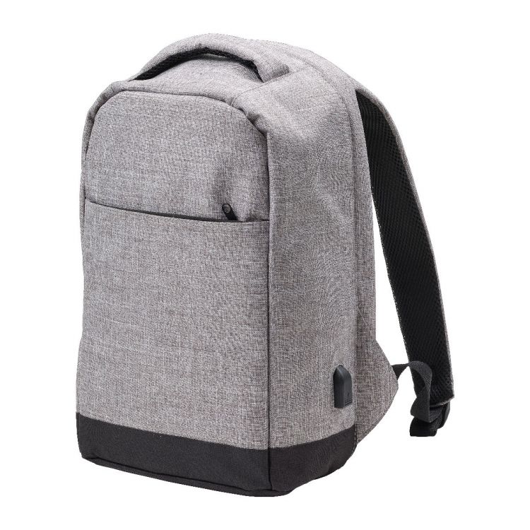 Polyester (600D) anti-theft backpack, with PVC backing. The backpack has a laptop compartment (13 inch), multiple interior pockets including a front pocket with zipper, and a USB port at the side with a cable on the inside.