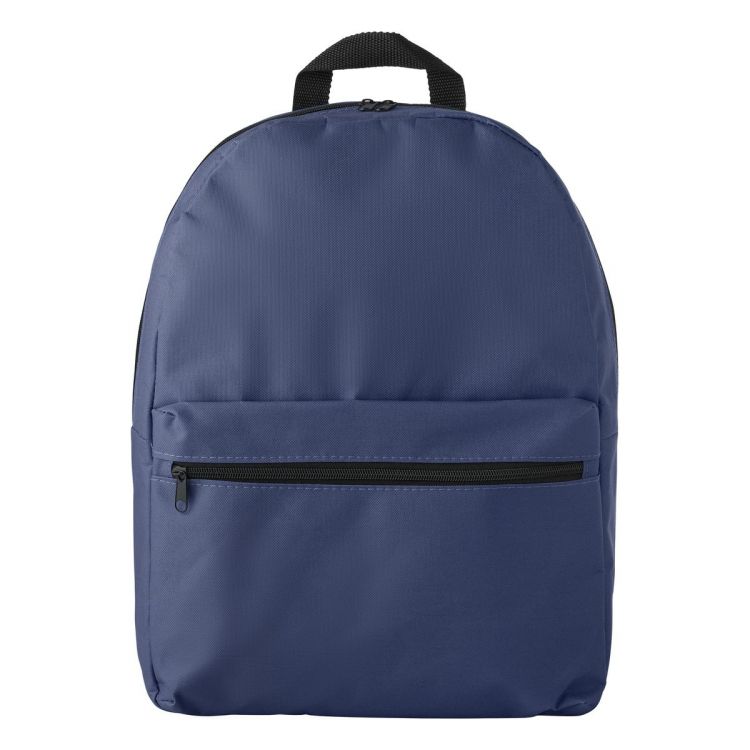 Polyester (600D) backpack with zipper on the main compartment and front pocket. The bag has adjustable, padded shoulder straps.