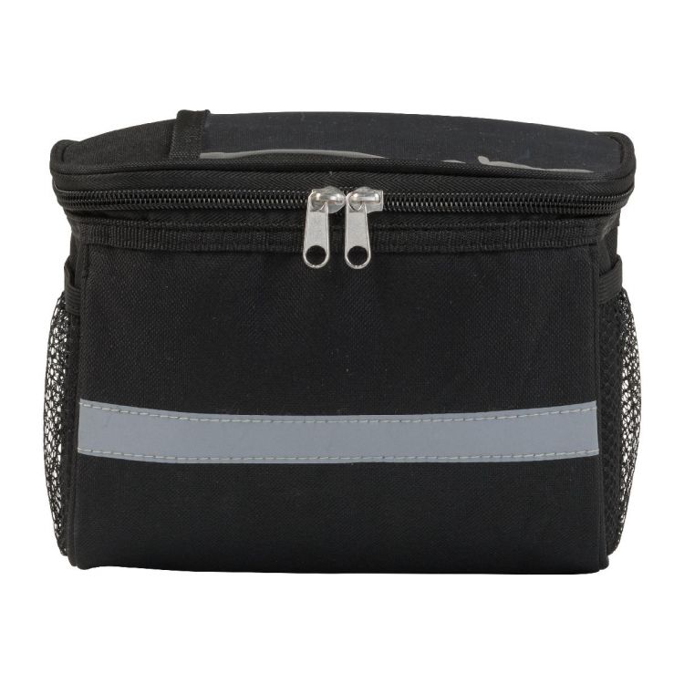 Polyester (600D) bicycle cooler bag with PEVA lining and a PVC pocket on top. Includes a reflective strap, mesh pockets on both sides, and a large cooler to be closed by a zipper.