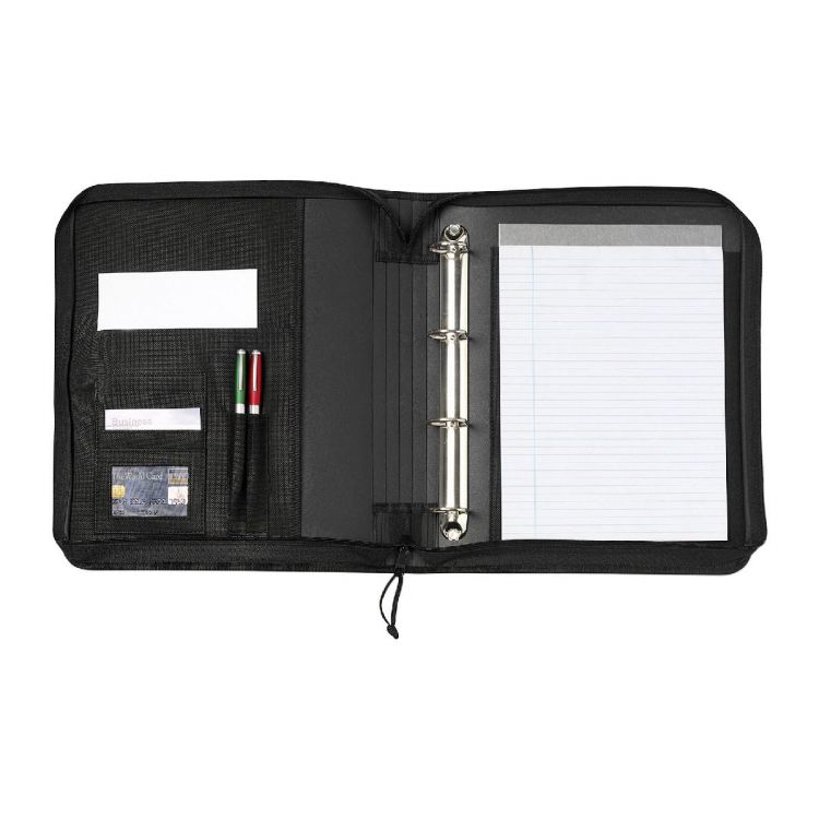 Polyester (600D) conference portfolio (approx. A4) with notepad with 30 pages, multiple pockets, pen loops (pens not included), and document case.