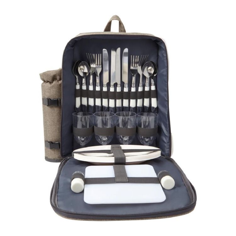 Polyester (600D) picnic rucksack with plastic cutlery for four people and a large cooling compartment. With an extra bottle holder and a set of salt and pepper shakers.