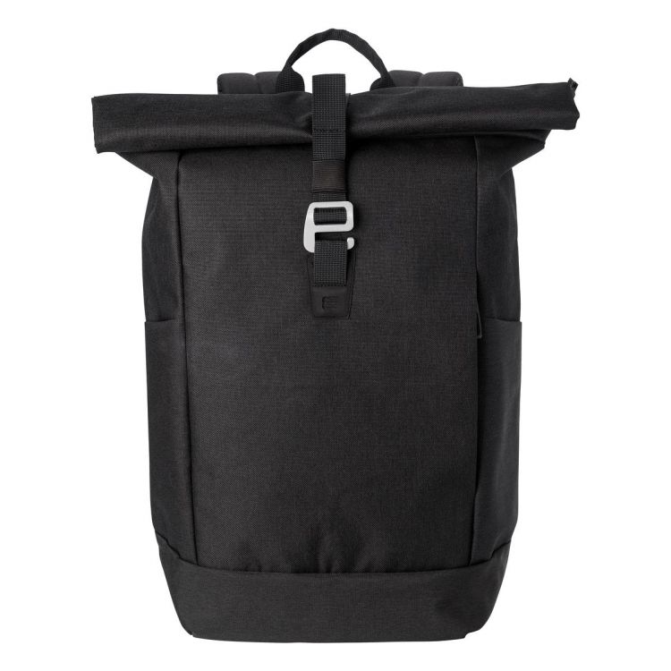 Polyester (600D) roll-top backpack. One large zippered compartment with two slip pockets and a laptop compartment. Zippered compartment in the front. Padded backside and straps. Metal hook for closure.