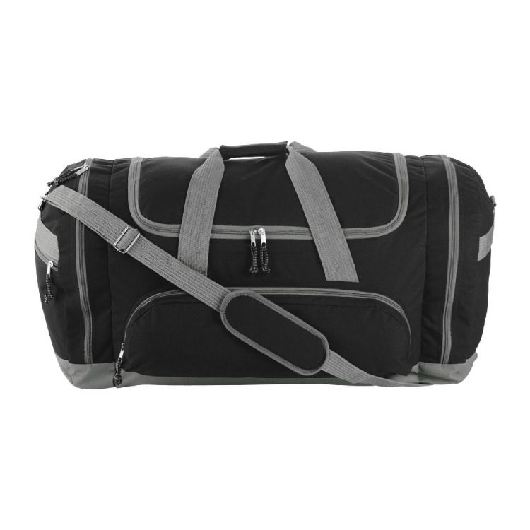 Polyester (600D) sports bag with various compartments and an adjustable shoulder strap.