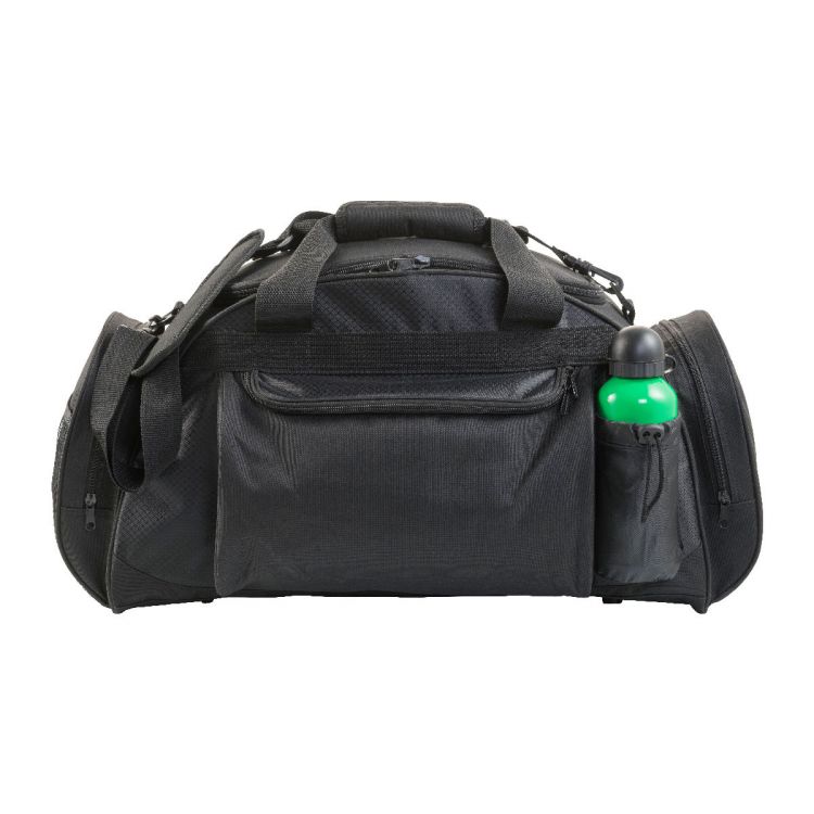 Polyester (600D) sports bag with a front zippered pocket, a side pocket for a bottle, a side pocket for a headset, and one large zipped compartment (bottle not included).
