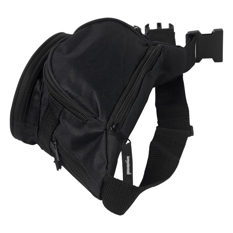 Polyester (600D) waist bag with five zippered pockets and an adjustable shoulder strap.